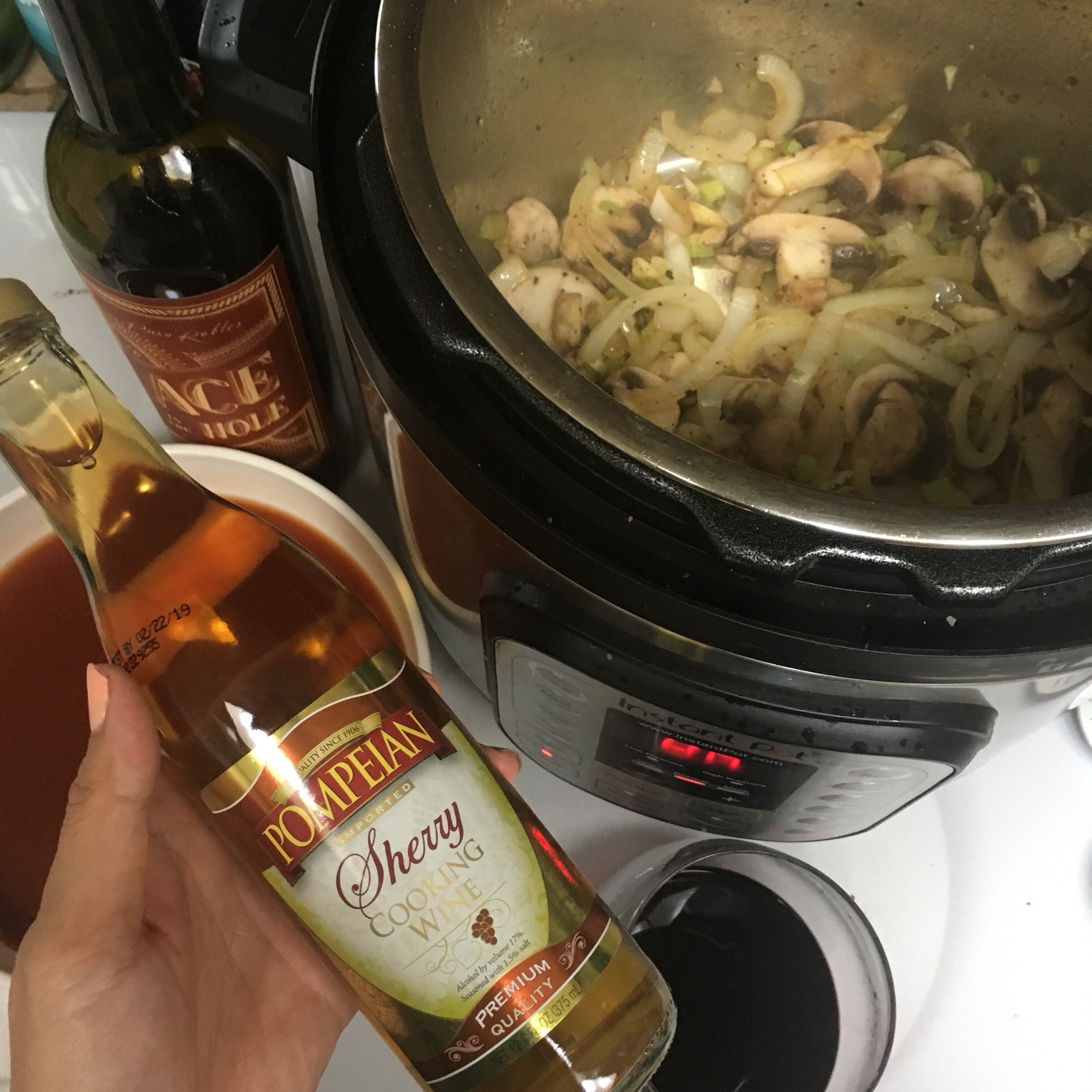 - Add a splash of sherry wine to deglaze the pot, be sure to loosen all the brown bits from the bottom of the pot with a wooden spoon then allow the wine to reduce.