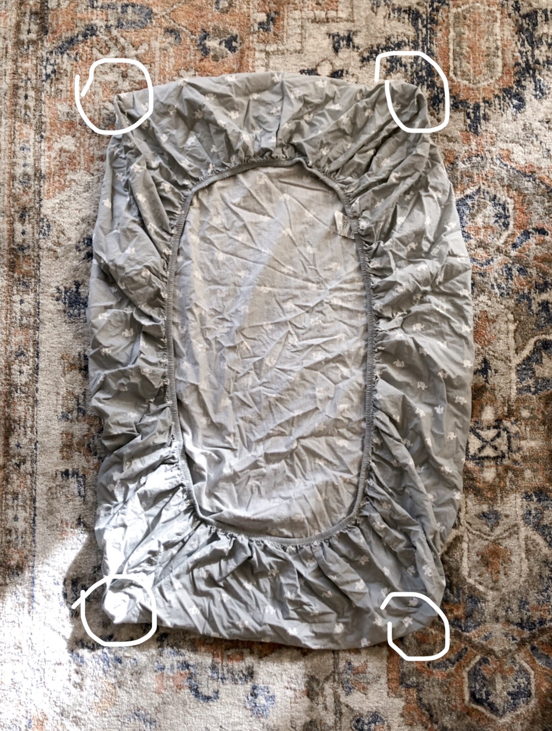 Lay out your fitted sheet as flat as you possibly can, with annoying crinkly elastic side up.